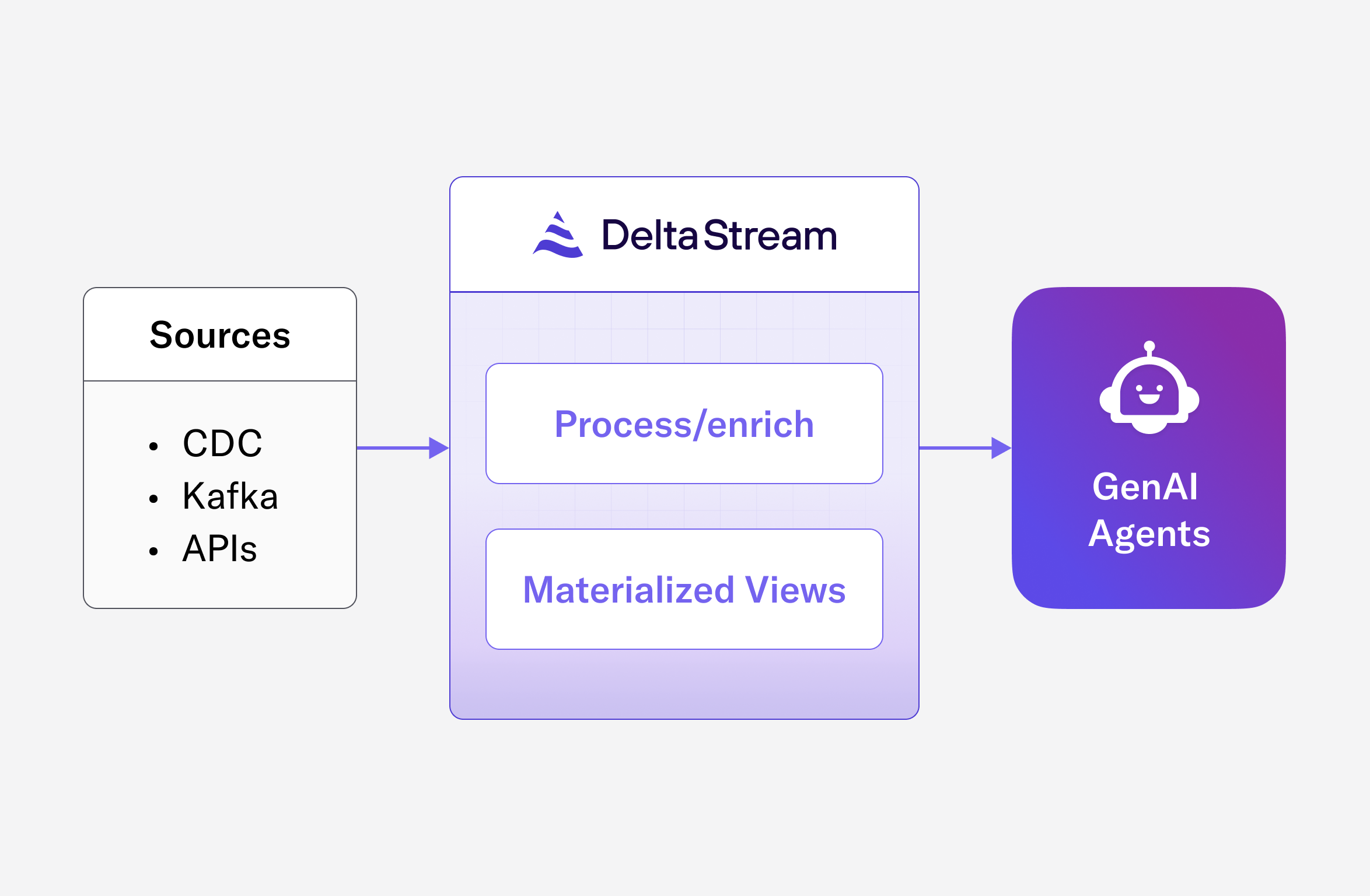 Instead of relying only on documents or batch pipelines, create a continuously updated view of your business reality directly from the source. A streaming context engine (such as DeltaStream) captures data as it arrives: