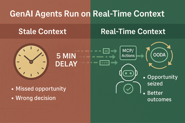 This is the "context gap"—the dangerous delay between a real-world event and an agent's awareness of it. When an agent's context is stale, even by a few minutes, its decisions degrade from brilliant to blundering. For many mission-critical use cases, there is a golden minute—a brief window of opportunity where acting on fresh, real-time information can create a magical outcome, while acting on stale data results in total failure.
