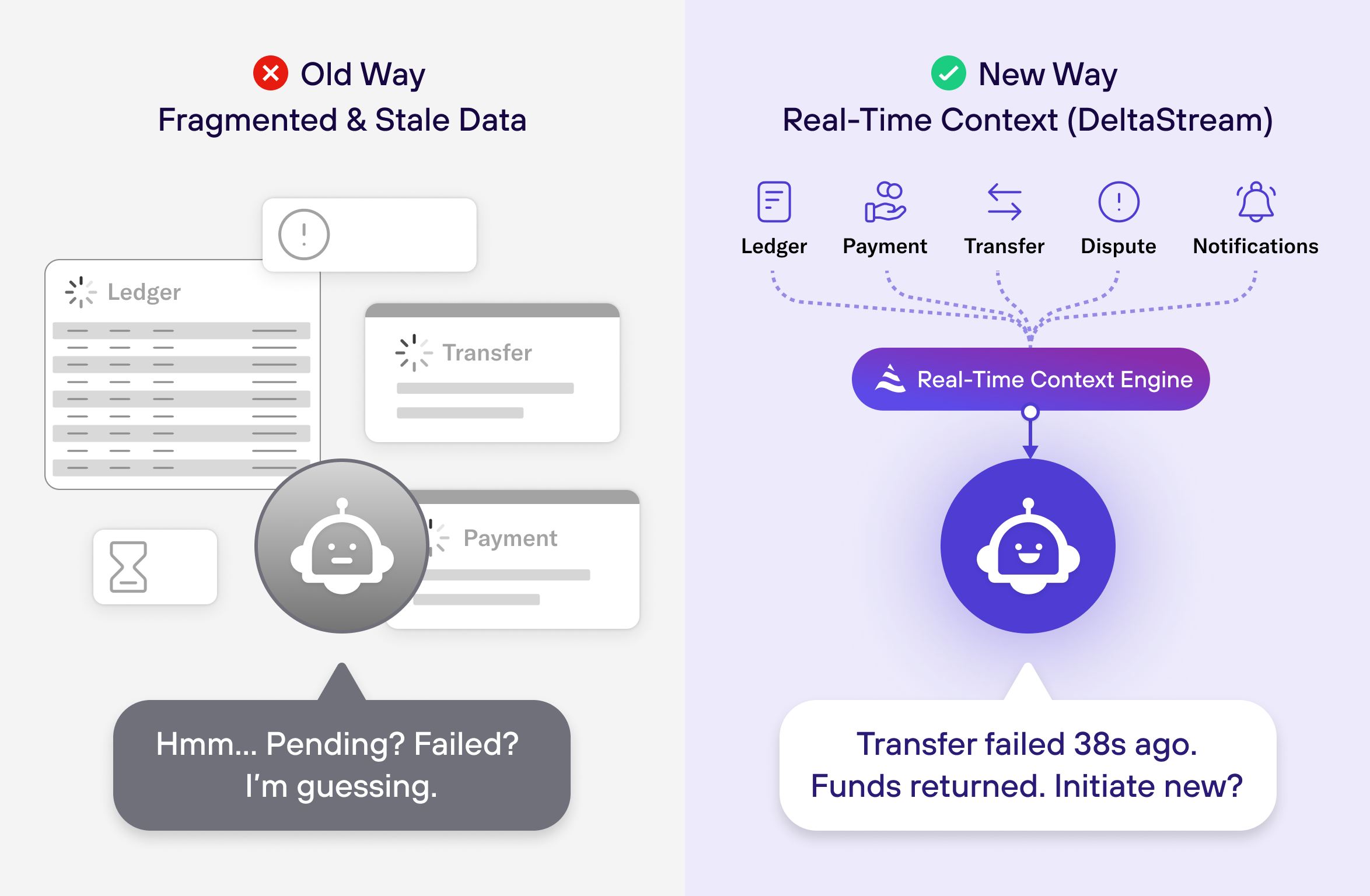 To answer support questions correctly, an agent needs a continuously updated view of the customer’s current state. Not partial data. Not best-effort snapshots. A coherent, consistent picture of reality that includes balances, authorizations, transfers, holds, disputes, and even what the customer was already told moments ago.