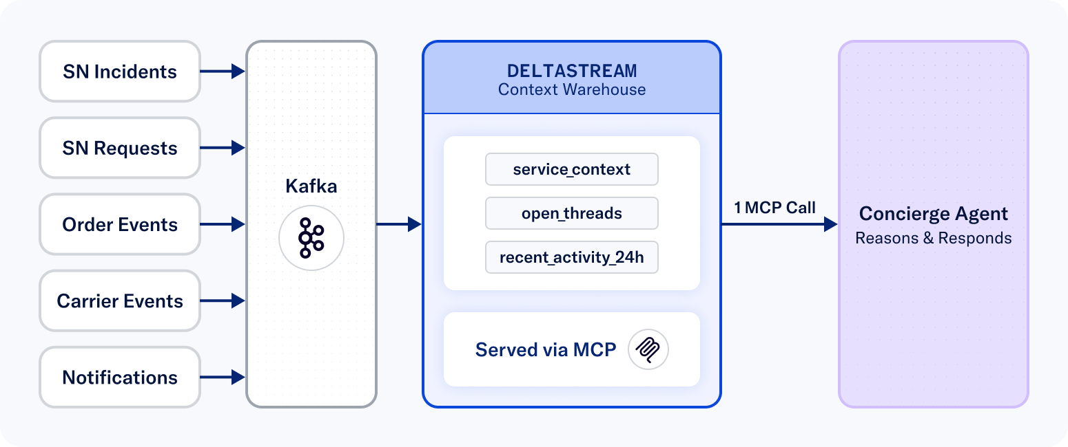 DeltaStream takes a different approach. Instead of asking agents to assemble context at runtime, DeltaStream continuously computes it as events flow in. ServiceNow incident opens, updates, and closures stream into Kafka. Delivery and carrier events stream in. Order state changes stream in. DeltaStream joins and enriches these streams in real time into materialized views that always reflect the current truth, a unified service context per customer, per order, per open service thread.