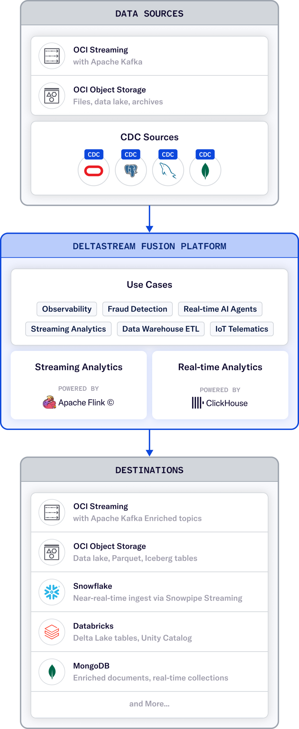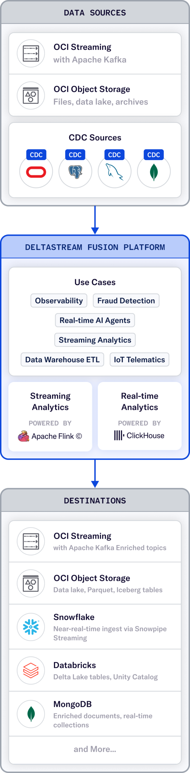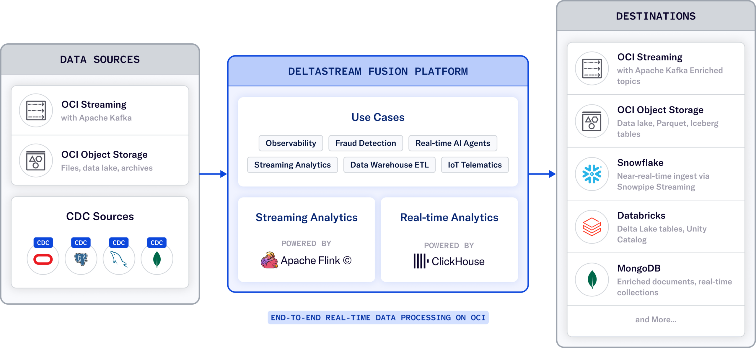 DeltaStream Flink is the answer: a fully managed Flink processing layer that runs inside the customer's OCI tenancy, connected natively to OCI Streaming with Apache Kafka. No cluster to provision, no infrastructure to operate.
